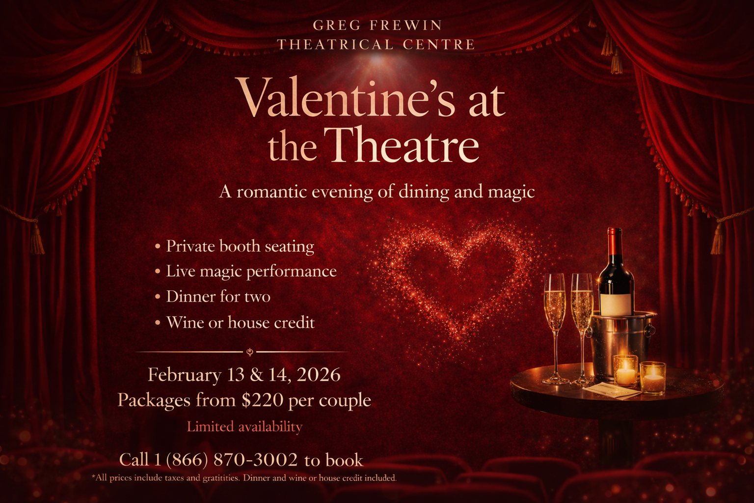 Celebrate Valentine’s weekend with a private booth, dinner, and unforgettable live magic at the Greg Frewin Theatrical Centre.