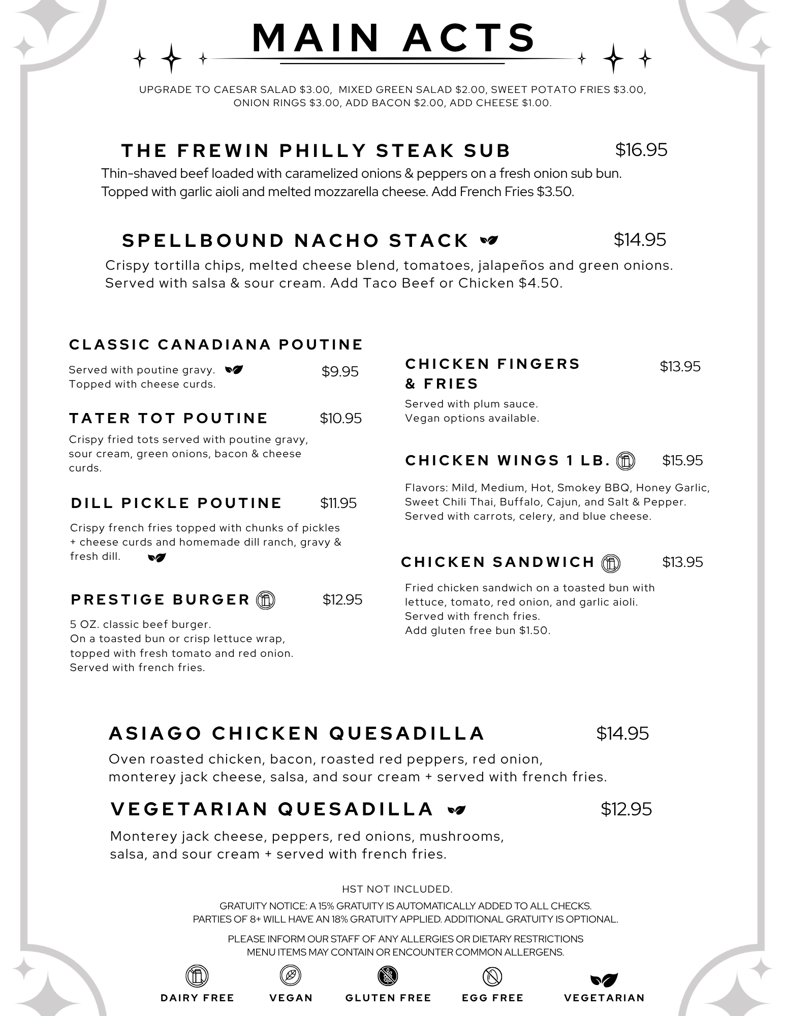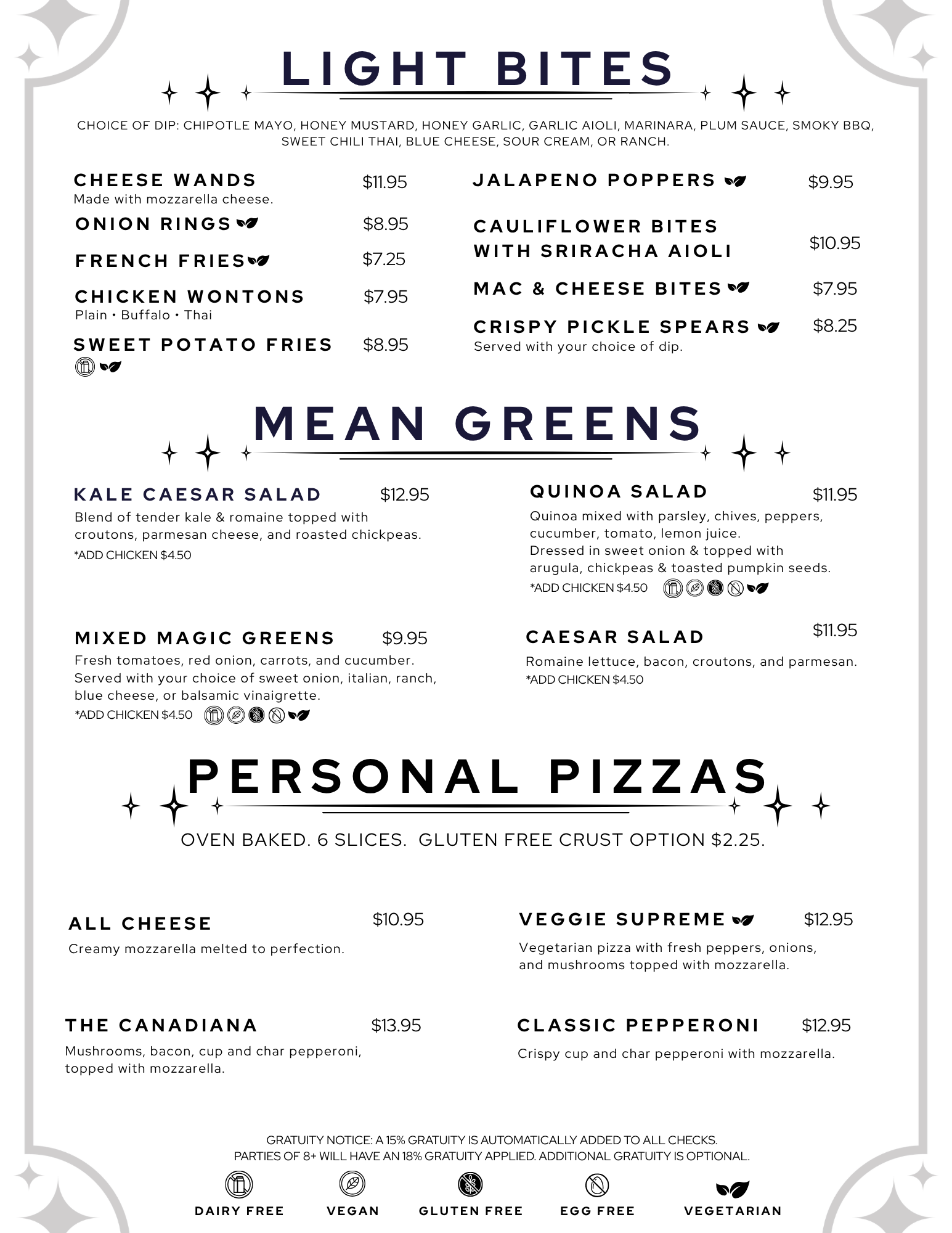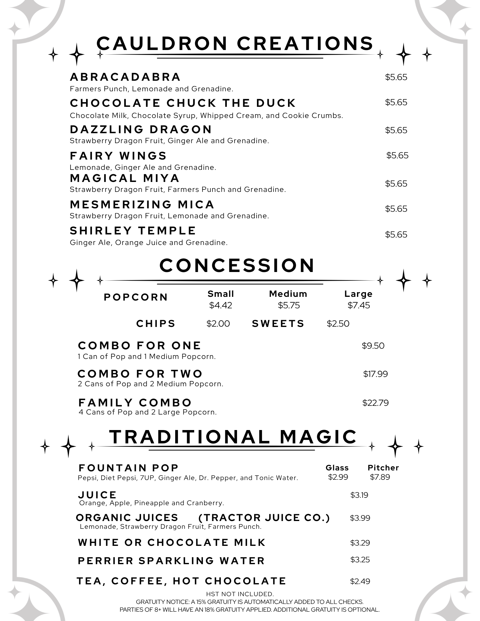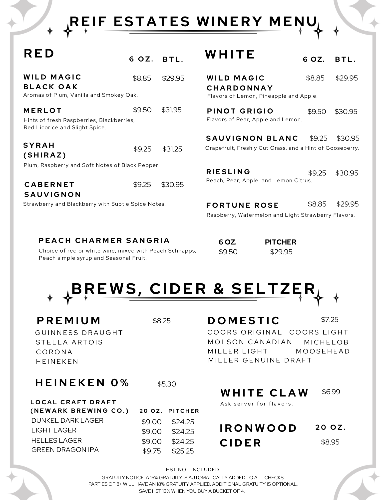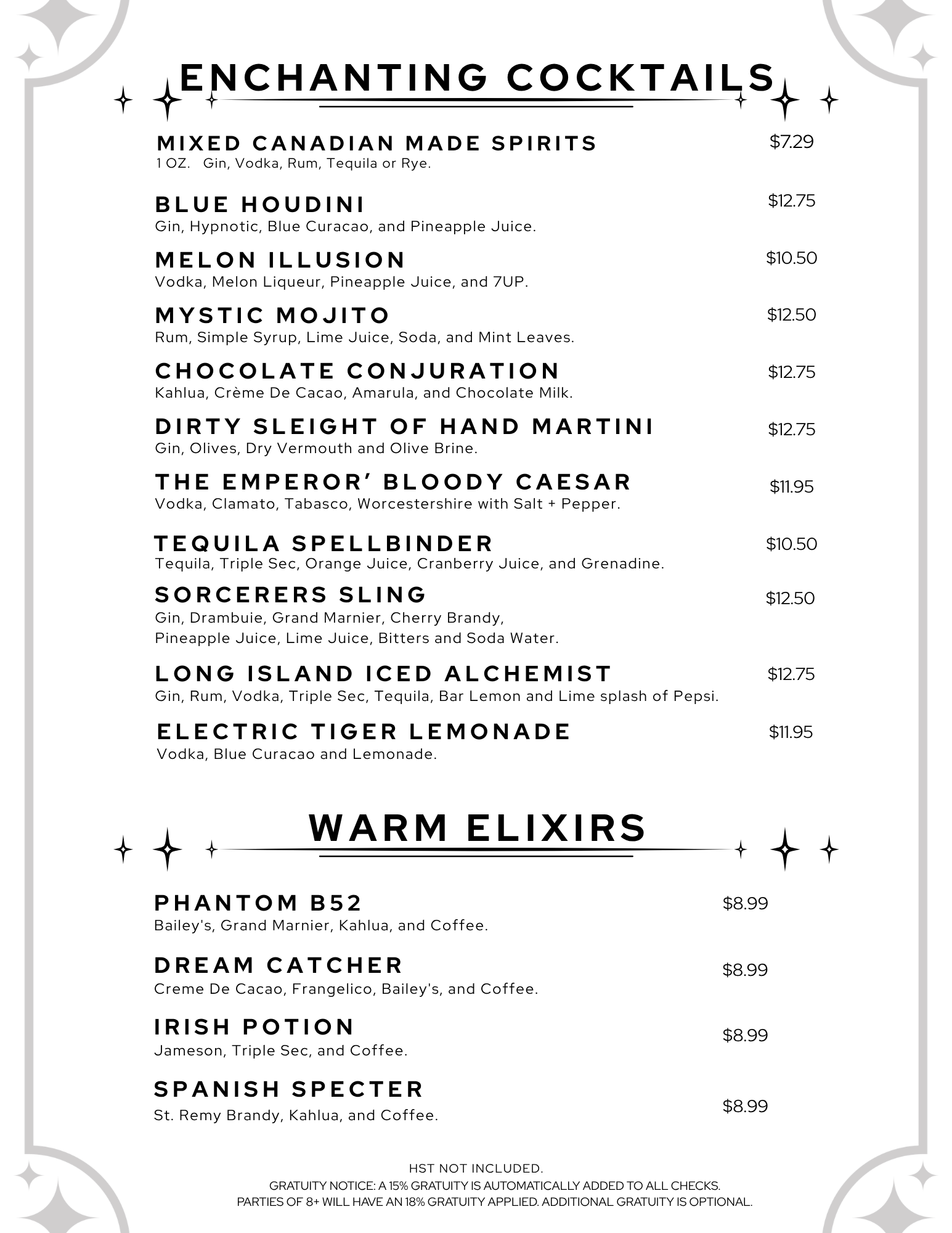 13% HST Charges Applicable To All Orders. 15% Gratuity will be applied to all bills, an additional 3% added on groups of 8+.