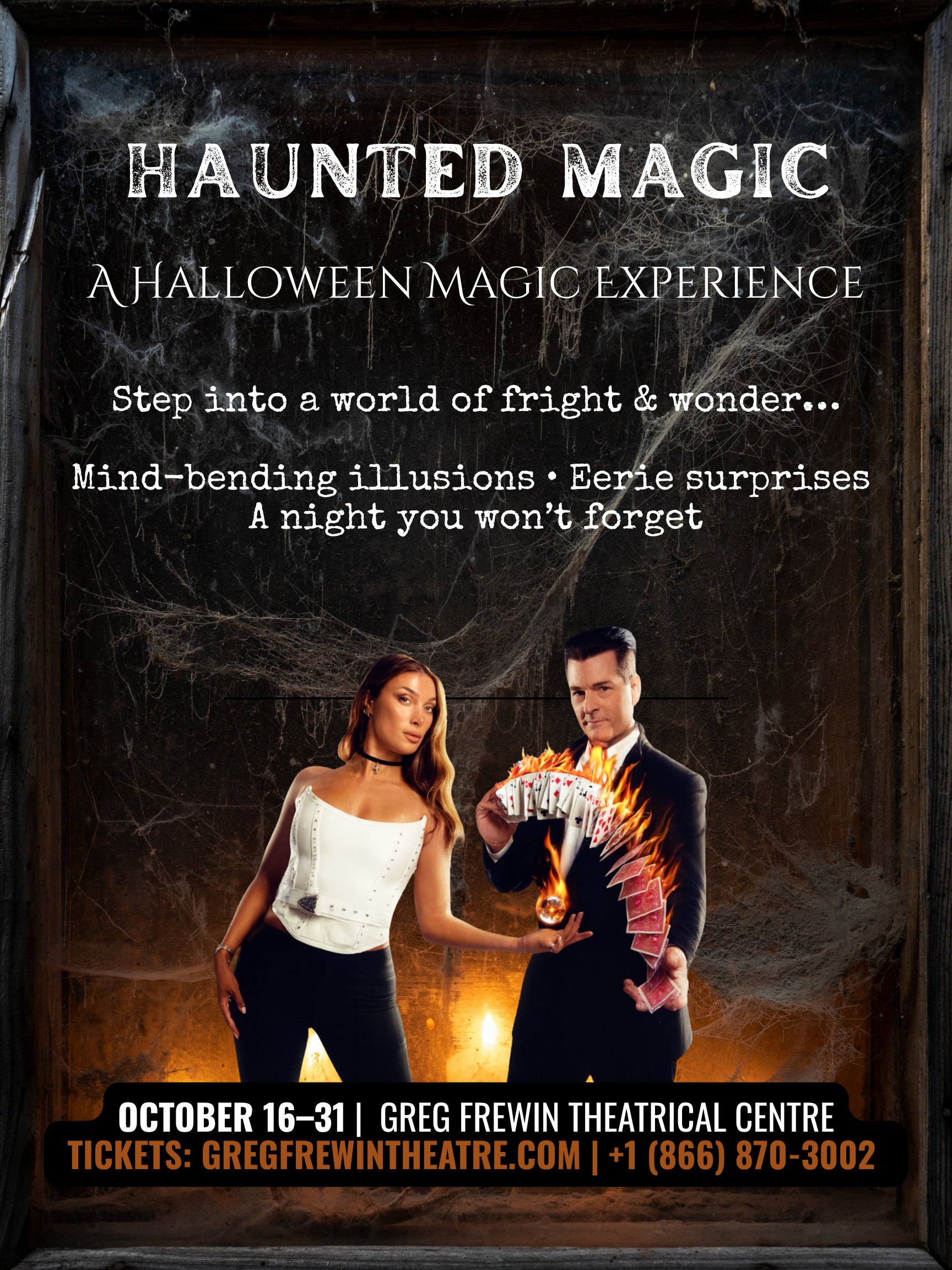 Step into a world of eerie wonder with the Haunted Illusions Halloween Experience at the Greg Frewin Theatre. Running October 16–31, this one-of-a-kind event transforms our signature Wild Magic show with a chilling seasonal twist — illusions reimagined with a spooky edge, a nightly costume contest, and the entire theatre immersed in a haunted Halloween atmosphere.